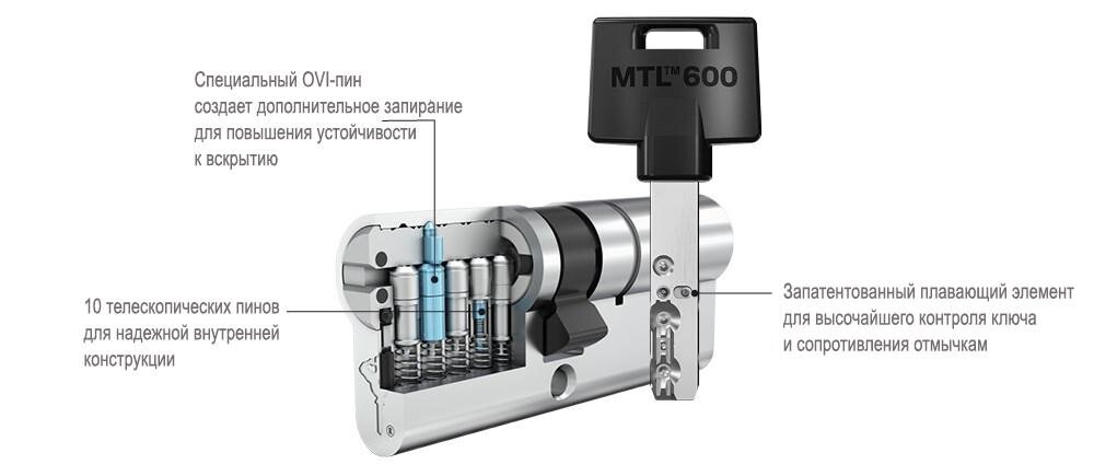 -Телескопическая система пинов (Патент Mul-T-Lock) цилиндры имеют уникальную систему внешних и внутренних телескопических пинов. Для открытия механизма цилиндра необходимо, чтобы и внешние и внутренние пины были одновременно разблокированы.